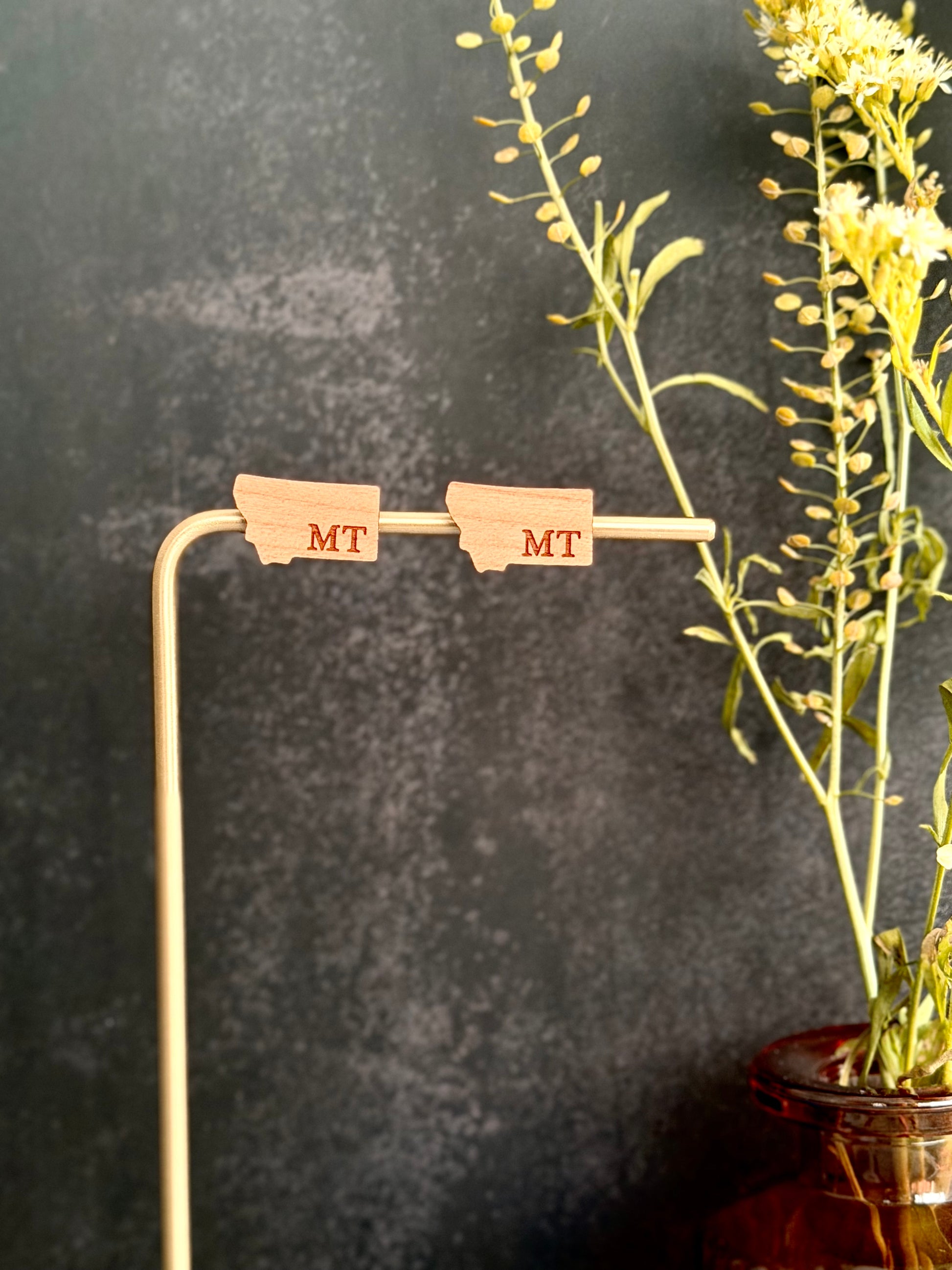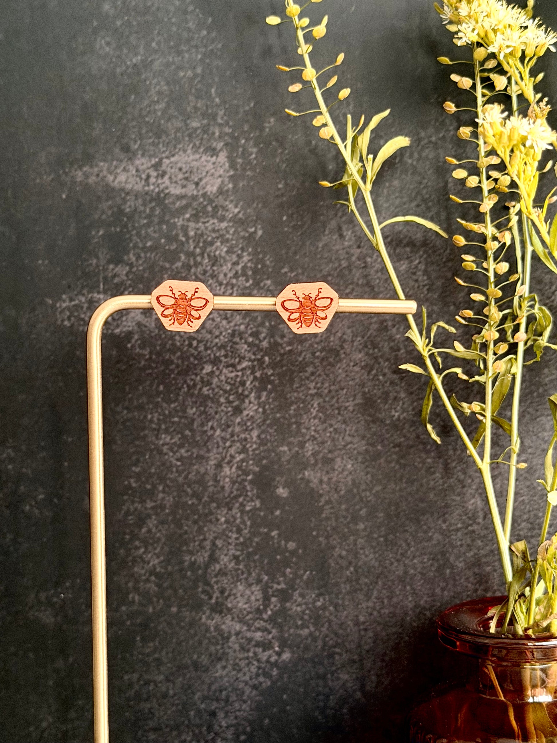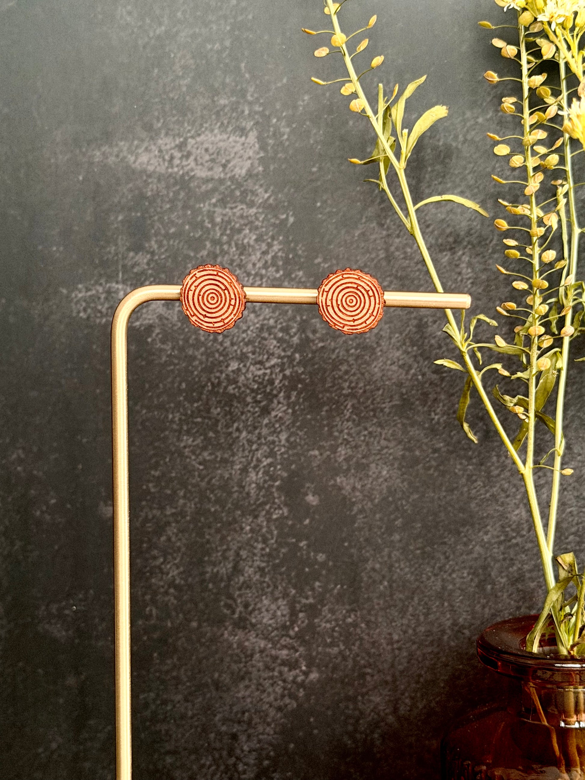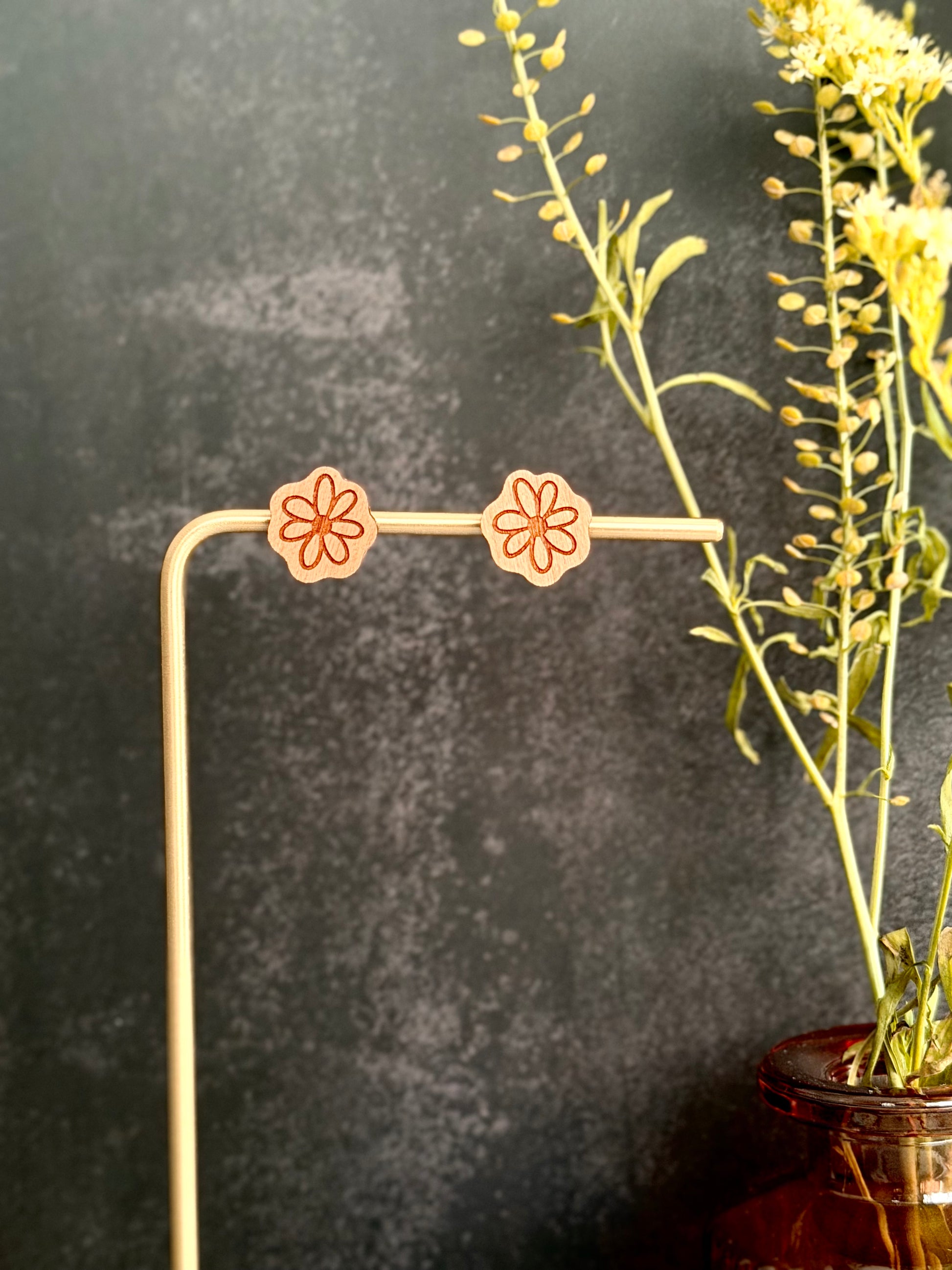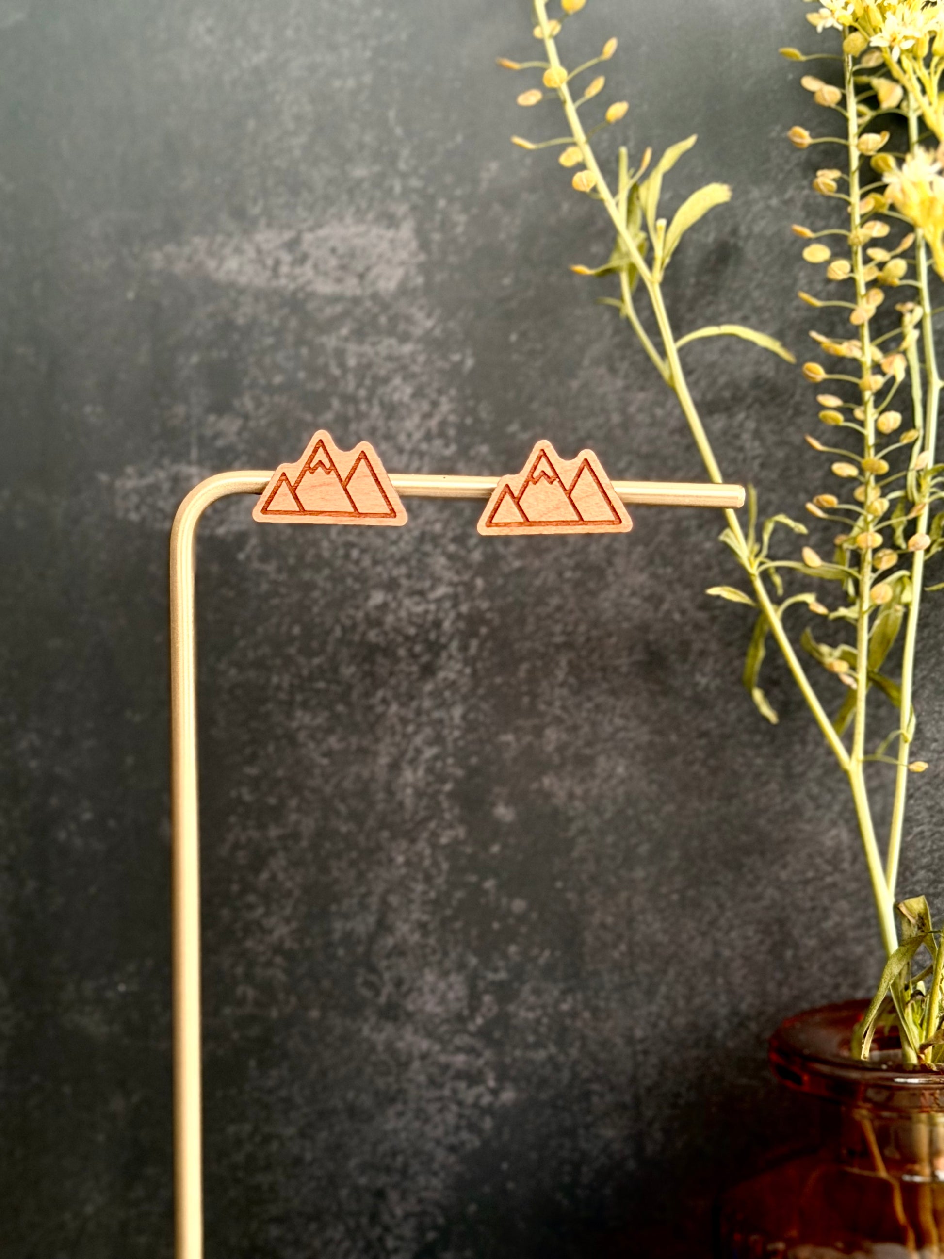 Pair of earrings made of various hardwoods and multiple designs. Earring hardware is made of hypoallergenic metal (gold-plated stainless steel). To maintain product quality, avoid exposing wood earrings to water.
